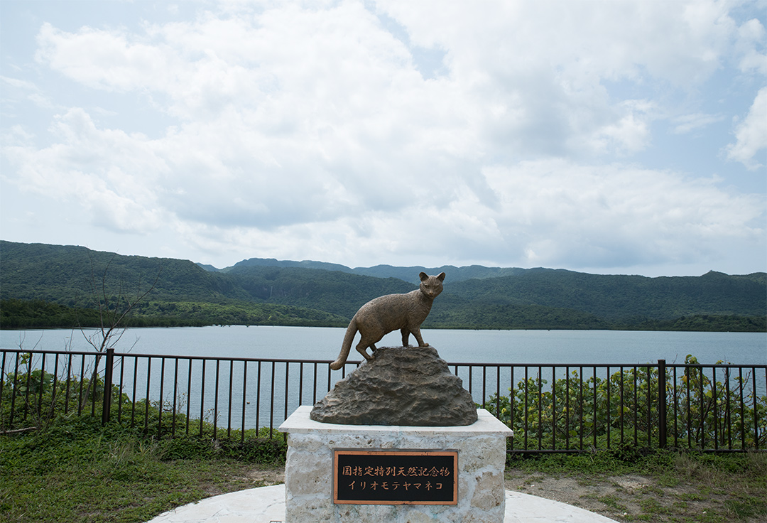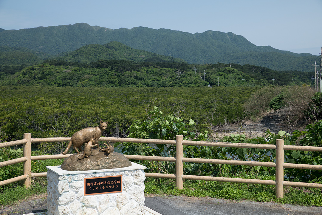 後良橋(しいらばし)にあるイリオモテヤマネコの像。後ろに広がるのは、マングローブと西表島の山々。