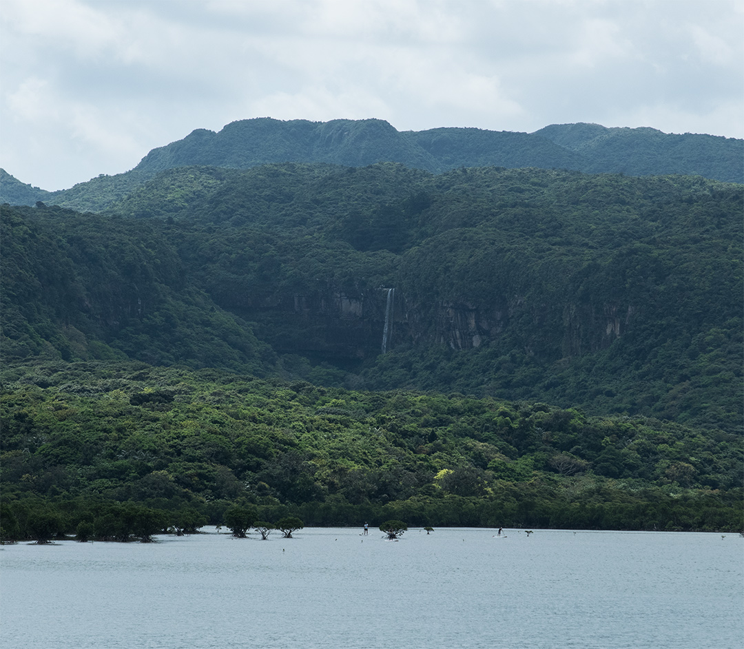 像の後ろに見えるピナイサーラの滝。落差54mは沖縄県では最大。滝に通じる普通の道はありません。