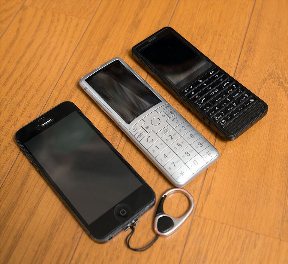 iPhone5、L-04B(コンラン・デザインのストレートケータイ)と並べてみると。